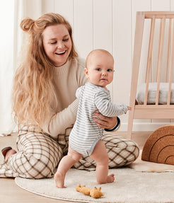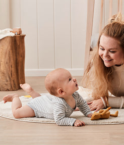 Perfect for in-between seasons this mid-weight fabric offers just the right balance of warmth and breathability. Soft, natural cotton with a touch of elastane to support your baby's movements offering a snug, yet flexible fit for natural sleep positions.