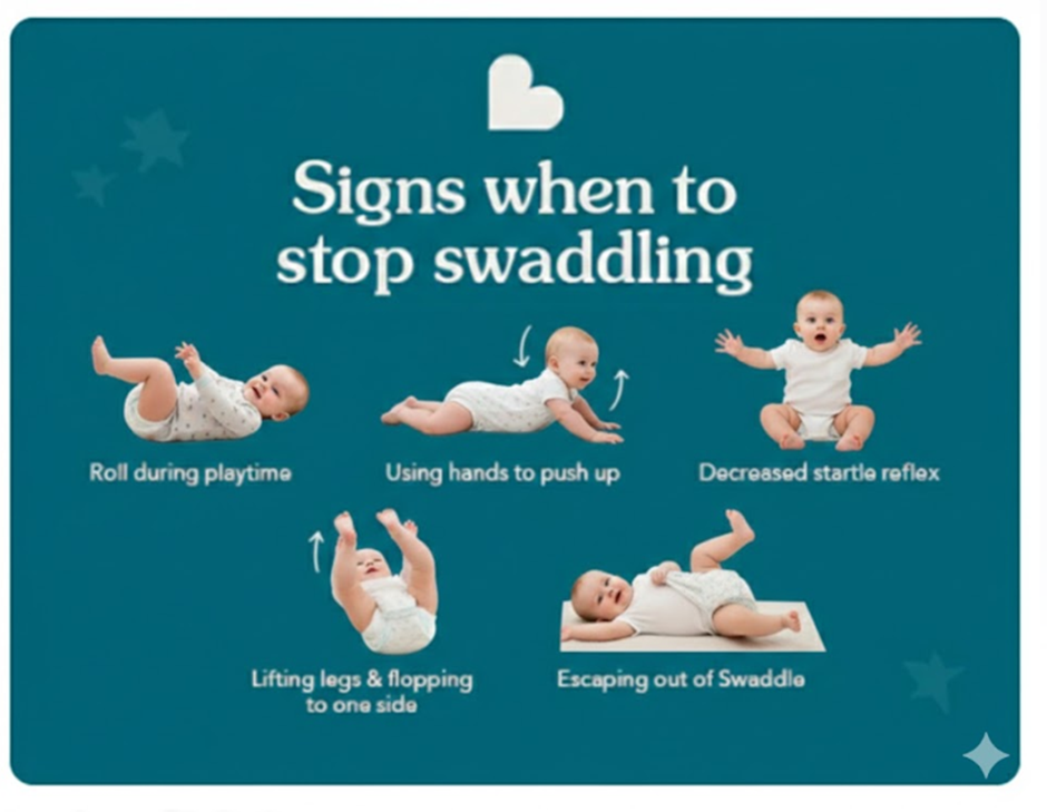 It is time to stop swaddling as soon as your baby shows signs of being able to roll over.